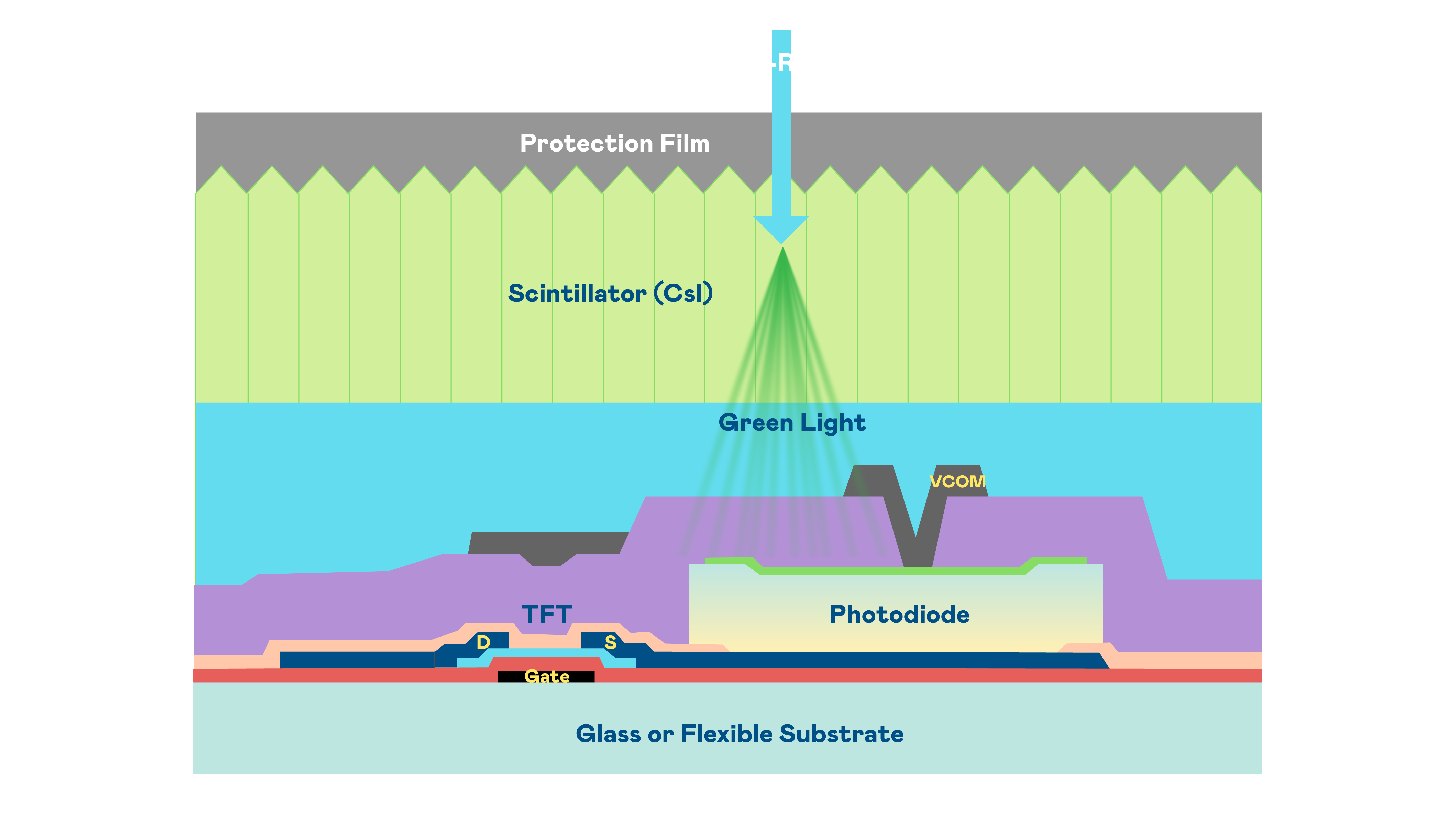 糖心vogo入口的X光影像感测阵列使用薄膜电晶体 (TFT) 作为每个像素的读取开关,搭配光电二极体(Photodiode)的光电转换元件,用以感测X光影像讯号。